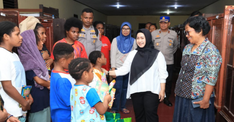 Pj. Ketua TP PKK Papua Tyas A. Fatoni menyerahkan bantuan kepada anak-anak korban kebakaran Panti Asuhan Pembawa Terang (Peter) Holtekamp. Bantuan ini diserahkannya langsung ke hunian sementara anak-anak panti asuhan di Sekolah Polisi Negara (SPN) Polda Papua, Jayapura, Papua, Selasa (30/09/2025) malam.