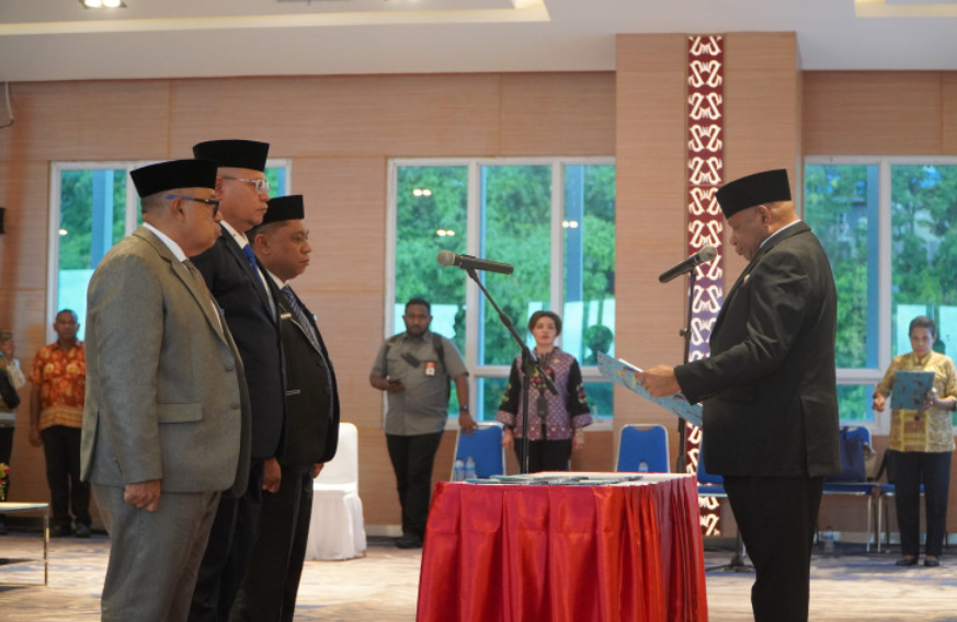 JAYAPURA - Pemerintah Provinsi Papua melakukan konsolidasi birokrasi melalui pelantikan Penjabat Sekretaris Daerah (Pj Sekda) dan dua Pejabat Pimpinan Tinggi Pratama di Aula Lukmen Jayapura, Kamis (20/11/2025). Pelantikan tersebut dipimpin Gubernur Papua, Matius D. Fakhiri, dan menjadi langkah awal penyusunan struktur kerja pada awal masa pemerintahannya.