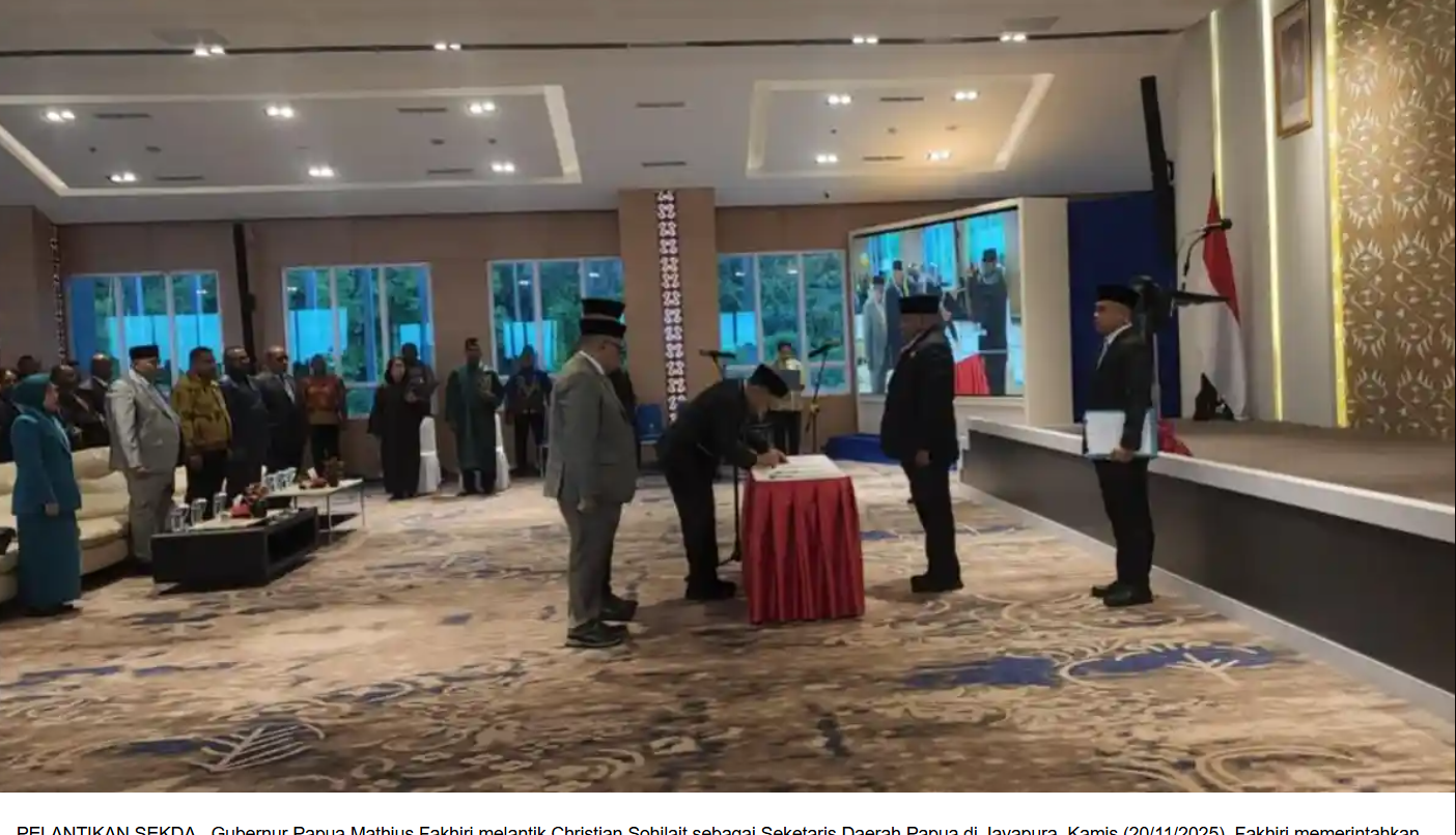 Gubernur Papua Mathius Fakhri melantik Christian Sohilait menjadi Pj Sekretaris Daerah (Sekda) di Ballroom Kantor Gubernur, Kota Jayapura, Kamis (20/11/2025).