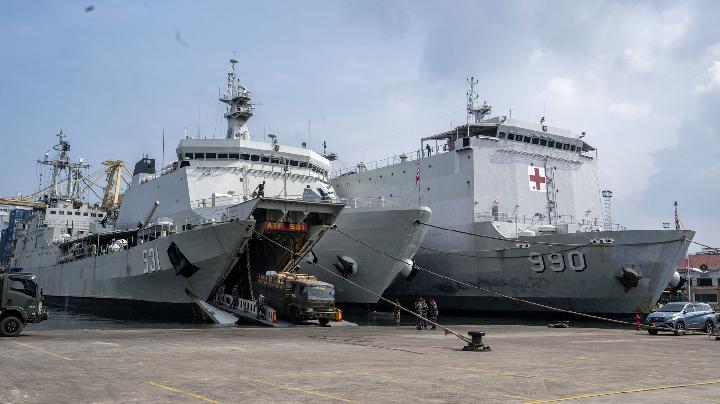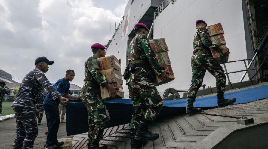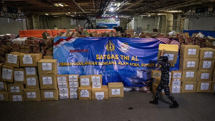 Prajurit TNI AL mengangkut bahan makanan ke dalam KRI dr Soeharso untuk misi kemanusiaan ke wilayah terdampak bencana di Kolinamil TNI AL, Jakarta, 30 November 2025. TNI AL mengerahkan KRI dr Soeharso, KRI Teluk Gilimanuk, KRI dr Radjiman Wedyodiningrat, KRI Semarang dan KRI Sutedi Senaputra yang membawa tim medis, logistik, personel penyelamat serta lima helikopter untuk mendukung operasi pencarian, evakuasi dan distribusi bantuan ke Aceh, Sumatera Utara dan Sumatera Barat. Antara/Bayu Pratama S