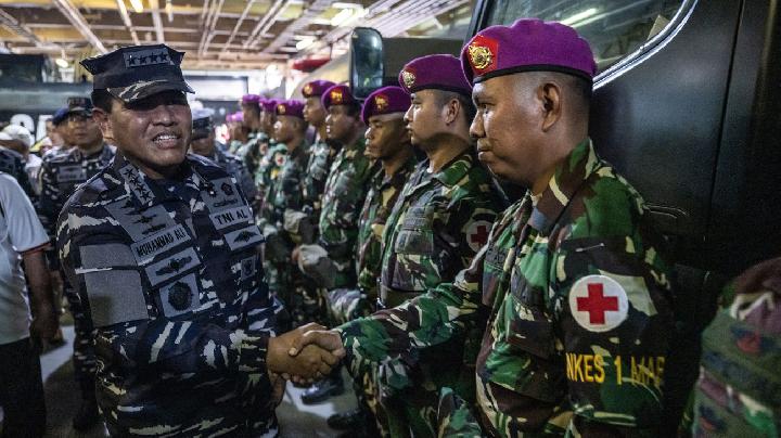 Kepala Staf Angkatan Laut Laksamana TNI Muhammad Ali (kiri) melepas Satgas TNI AL untuk misi kemanusiaan ke wilayah terdampak bencana di KRI dr Soeharso, Jakarta, 30 November 2025. Antara/Bayu Pratama S