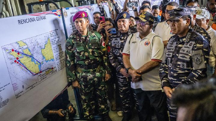 Kepala Staf Angkatan Laut Laksamana TNI Muhammad Ali (kanan) bersama Wakil Gubernur DKI Jakarta Rano Karno (kedua kanan) dan Komandan KRI dr Soeharso Kolonel Laut (P) Imam Ibnu Hajar (ketiga kanan) mengamati peta bencana saat pelepasan Satgas TNI AL untuk misi kemanusiaan ke wilayah terdampak bencana di KRI dr Soeharso, Jakarta, 30 November 2025. Antara/Bayu Pratama S